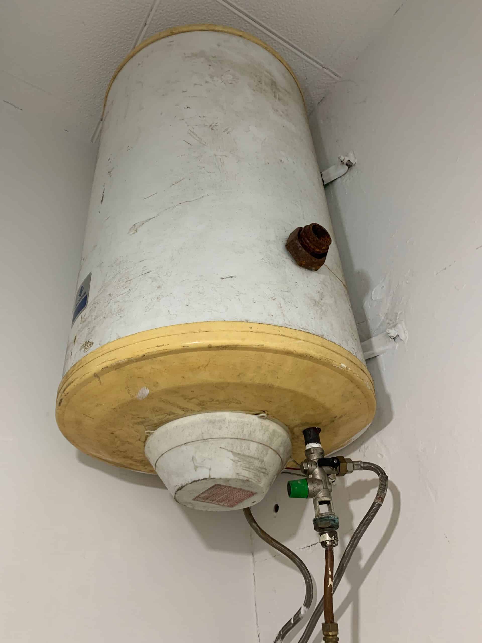 L'appareil trônait en hauteur, dans un espace plutôt étriqué qui compliquait l'accès. La cuve elle-même laissait apparaître des traces d'usure sur le revêtement extérieur. Plus inquiétant encore : l'étanchéité des raccordements semblait compromise à plusieurs endroits.